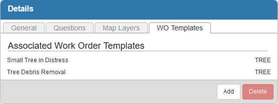 Work order templates that are already associated to the service request template are shown in the Associated Work Order Templates section.