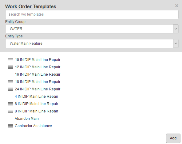 - Select a work order from the list on the Work Order Templates panel. To more easily find the template, you can select an Entity Group and Entity Type to filter the list, or you can begin typing the name of the template in the search field at the top of the panel.