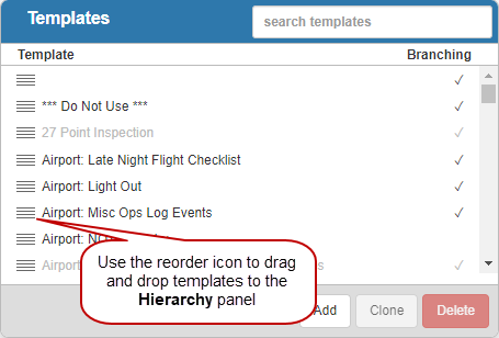 - Add templates to the categories. Click the reorder icon next to any template in the Templates panel and drag it to the desired category in the Hierarchy.