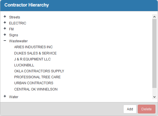The Contractor Hierarchy panel is used to organize the contractors into categories to make them easy to find when adding contractor labor, material, or equipment to a work order. A contractor can reside within more than one category.