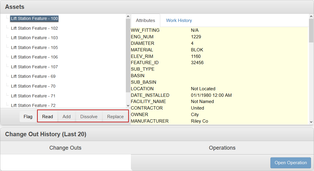 These fields, along with any asset type change out fields configured for the asset in Designer, appear when an asset is selected and you click Read, Add, Dissolve, or Replace on the Equipment Change Out page.