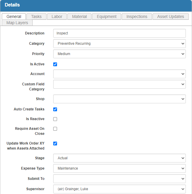 For an explanation of fields on the General tab, see Work Order Template Fields.
