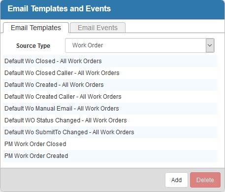 - Click Add on the Email Templates tab to create templates related to work orders, service requests, inspections, and comments.
