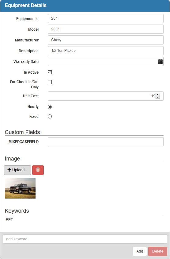Add or update equipment to add to a work order. You can add keywords to equipment to make it easy to search.