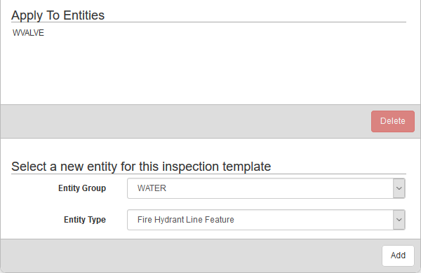 - To add a new entity, select the Entity Group and the Entity Type under Select a new entity for this inspection template and click Add.
