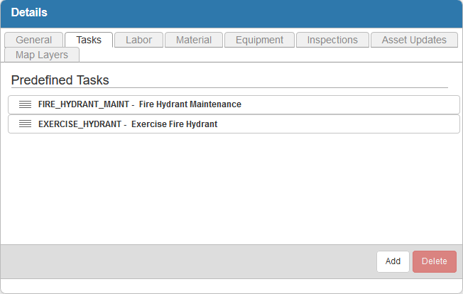 Predefined tasks, or a predefined set of steps necessary to complete a work order, can be included on a work order template so that they are automatically included on any work order created from the template. Additional tasks may be added on the work order in addition to the predefined tasks if necessary.