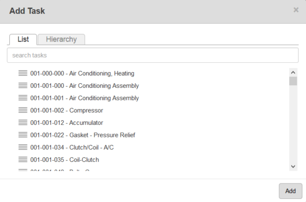 The List tab lists all the tasks and can be filtered by typing the first few letters of the tasks in the search box at the top. The Hierarchy tab displays all of the tasks in a hierarchy view.