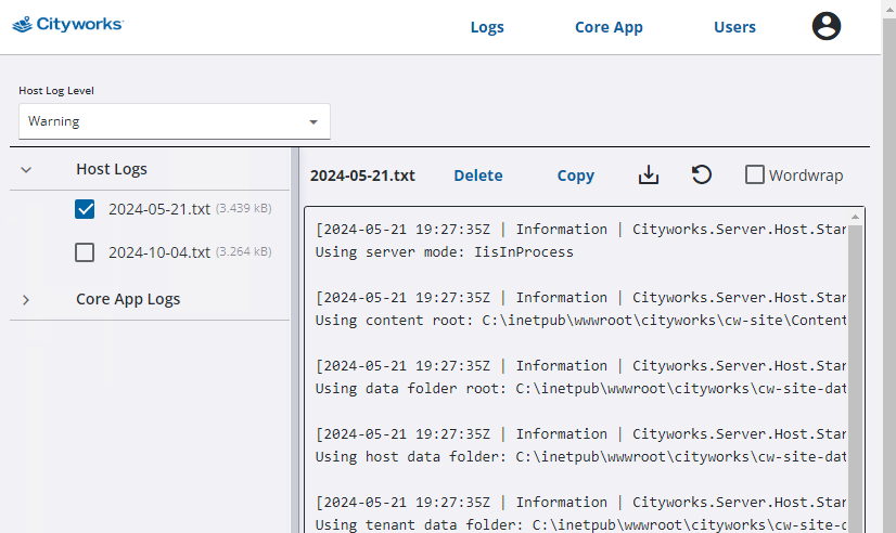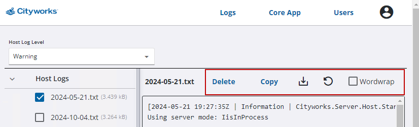 1. You can expand Host Logs or Core App Logs and select a log to view it.