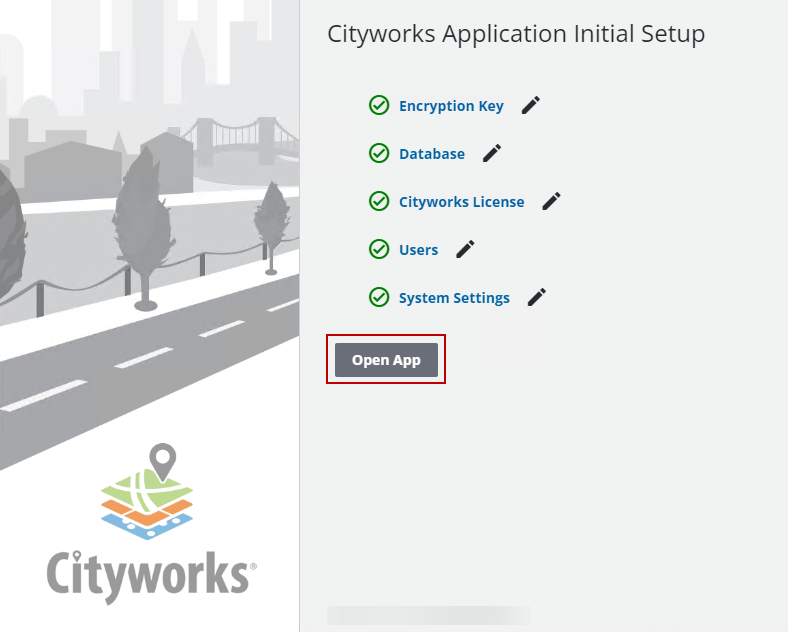 1. To log in to the host, click Open App from the Cityworks Application Initial Setup page.