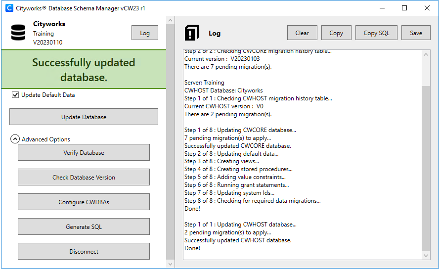Database Schema Manager shows the progress while it checks the CWVERSION and migration history tables. Click Log to open or close the log. When the log is open, there are the following options: Clear the contents of the log, Copy the log’s contents to clipboard, Copy SQL to only copy the SQL scripts, or Save the log’s contents. The Log also states any data migrations that need to be completed. See Data Migration Manager Guide for more information.