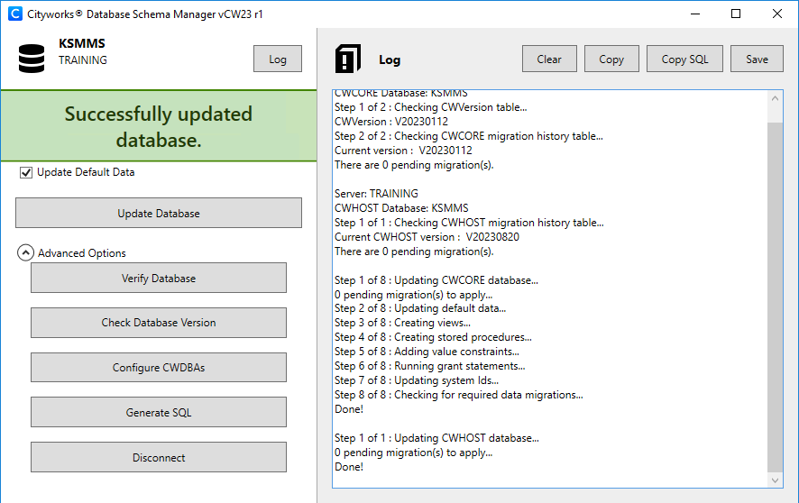 Database Schema Manager shows the progress while it checks the CWVERSION and migration history tables. Click Log to open or close the log. When the log is open, there are the following options: Clear the contents of the log, Copy the log’s contents to clipboard, Copy SQL to only copy the SQL scripts, or Save the log’s contents. The Log also states any data migrations that need to be completed. See Data Migration Manager Guide for more information.