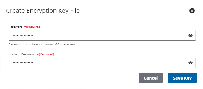 - On the Create Encryption Key File panel, enter the password in the Password and Confirm Password fields. The password must be at least eight characters long.