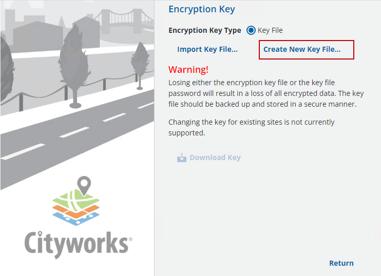 Key files encrypt data to provide greater security. If you are installing Cityworks 23.x for the first time, a key file needs to be generated.