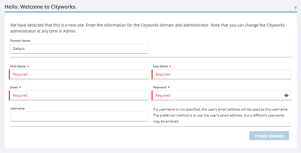 A Cityworks domain and administrator login needs to be created.