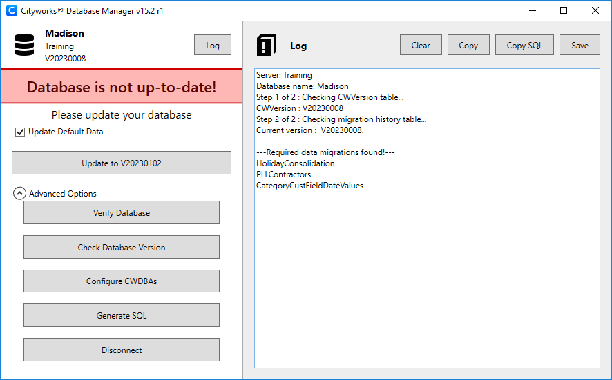 • Verify Database: This option verifies the structure of the Cityworks database and identifies any errors. The errors are displayed in the log, followed by a list of SQL scripts that can be run to correct the errors.