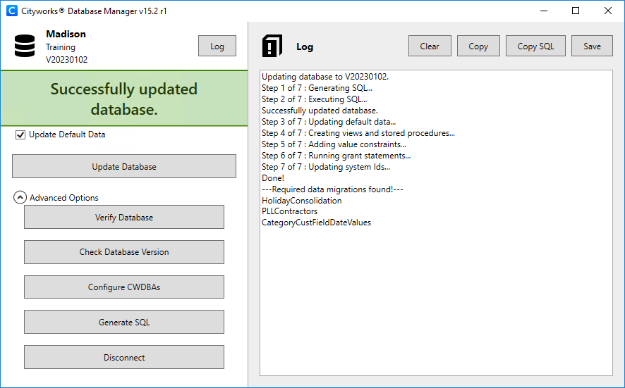Once the six steps have been successfully completed, users will receive a message indicating that the database was successfully updated. If not, the log will show where any issues were encountered. The Log also states any data migrations that need to be completed. See Data Migration Manager Guide for more information.