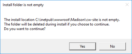 A message appears explaining that the cw-site folder will be overwritten during the install process.