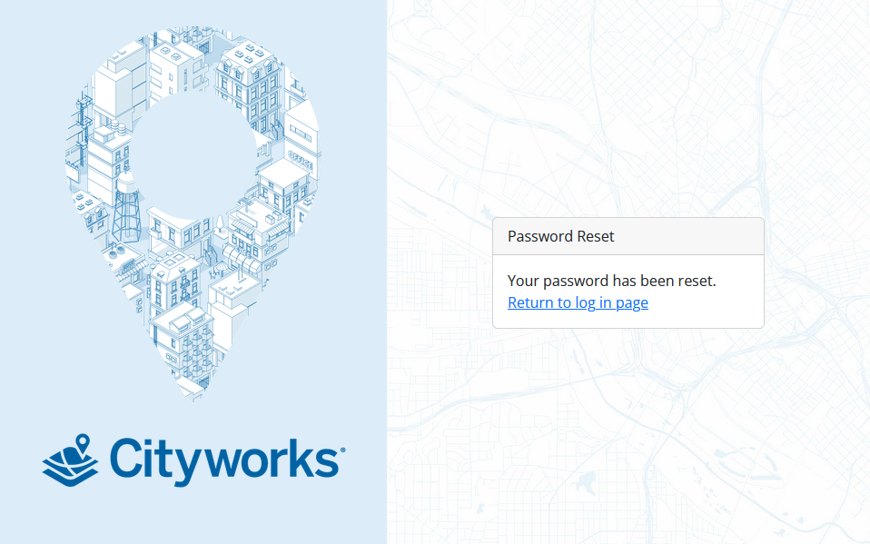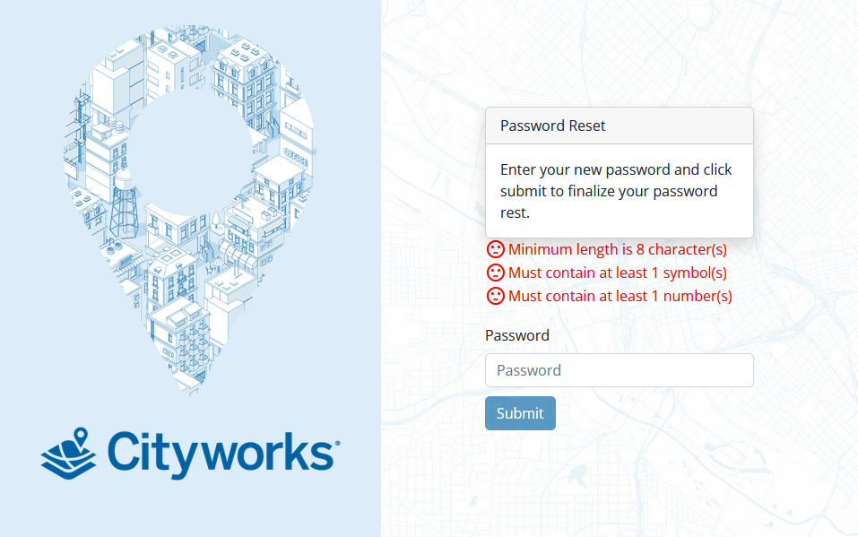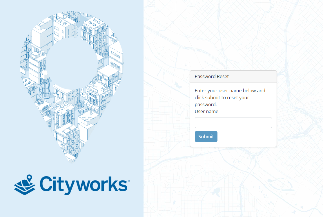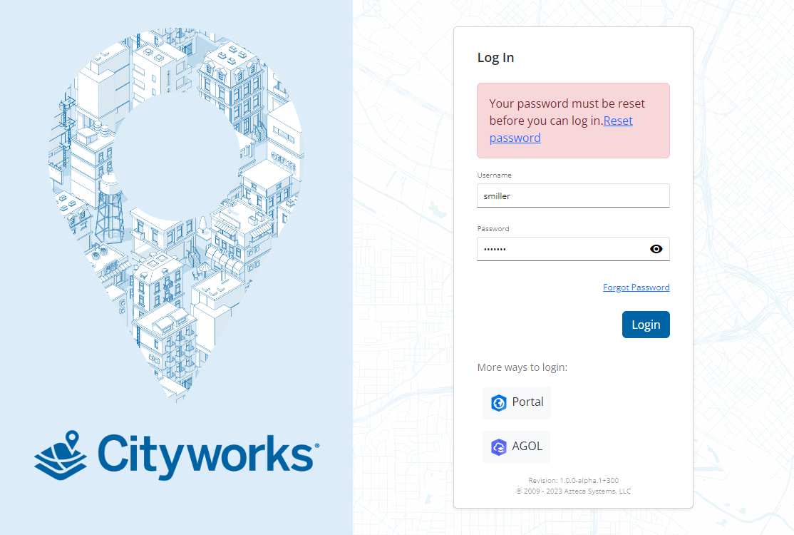 Security updates have been implemented at 23, therefore Forms Authentication users must reset their password when they log in to Cityworks 23.x for the first time. The password only needs to be reset once when upgrading to Cityworks 23 or newer. This does not apply to users who log in using Single Sign-on or Active Directory users.