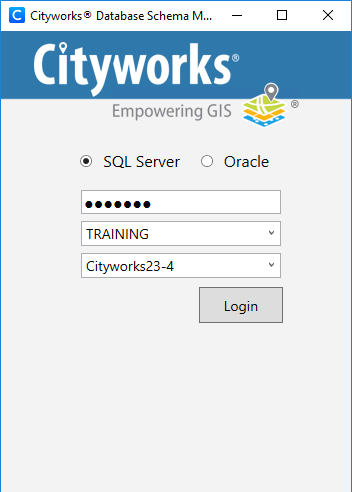 - Select the server instance and Cityworks database from the drop-down lists.