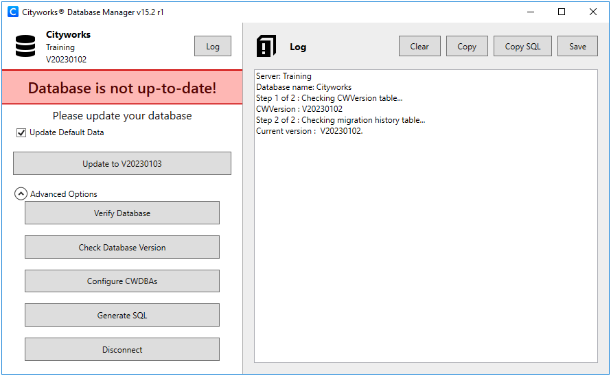 - Select the server instance and Cityworks database from the drop-down lists.