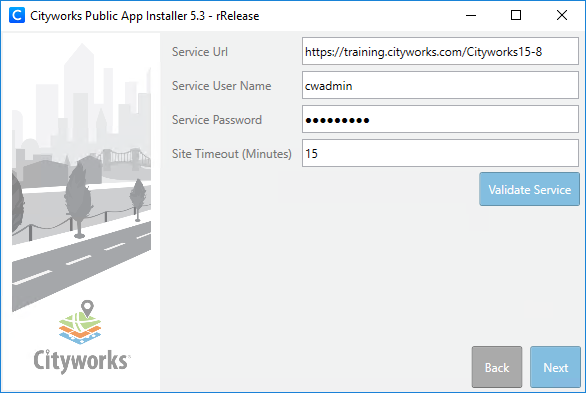 1. Enter the address for the Cityworks site in the Service URL field. The installer provides an example to assist.