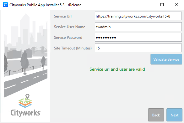 A message will indicate whether the service URL and user are valid. It also checks to make sure your version of Cityworks is compatible with the version of Public Access being installed.