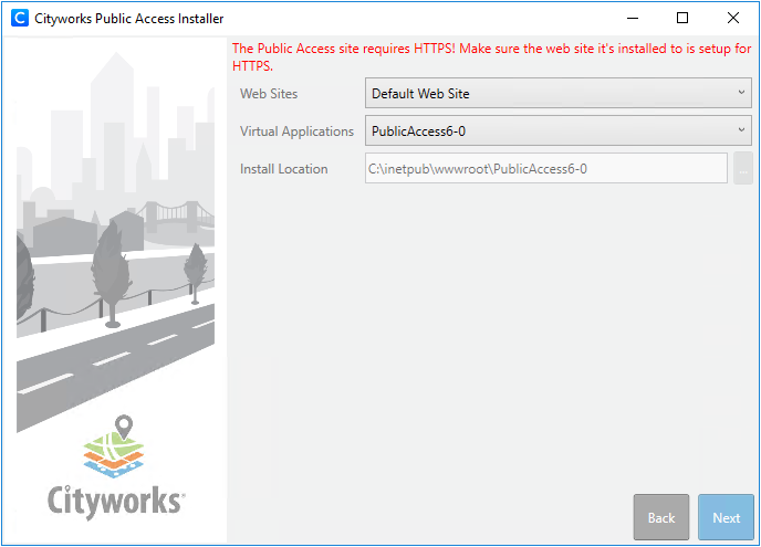 A message will indicate whether the service URL and user are valid. It also checks to make sure your version of Cityworks is compatible with the version of Public Access being installed.