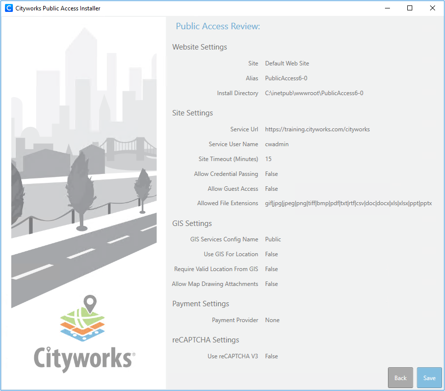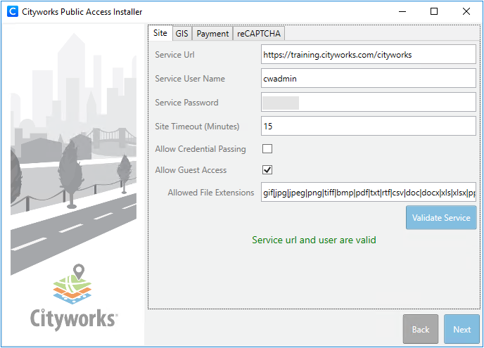 A message will indicate whether the service URL and user are valid. It also checks to make sure your version of Cityworks is compatible with the version of Public Access being installed.
