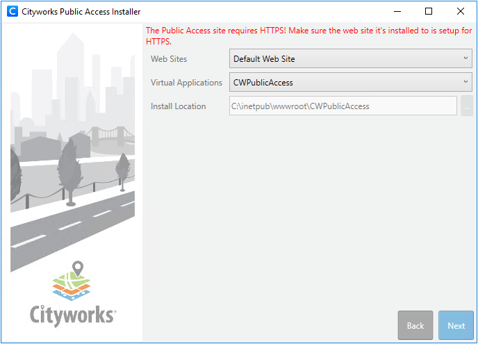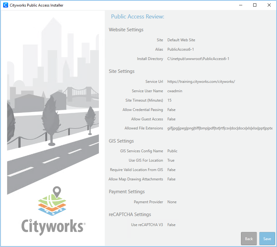 A message will indicate whether the service URL and user are valid. It also checks to make sure your version of Cityworks is compatible with the version of Public Access being installed.