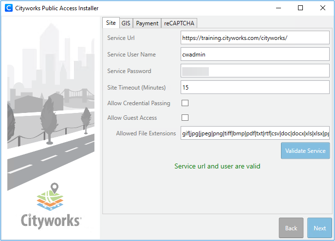 • Enter the address for the Cityworks site in the Service URL field. This field is required to validate the service. The installer provides an example to assist.