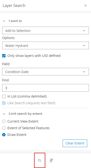 • If you have assets selected on the map and want to limit the search by the extent of those assets, select Extent of Selected Features.