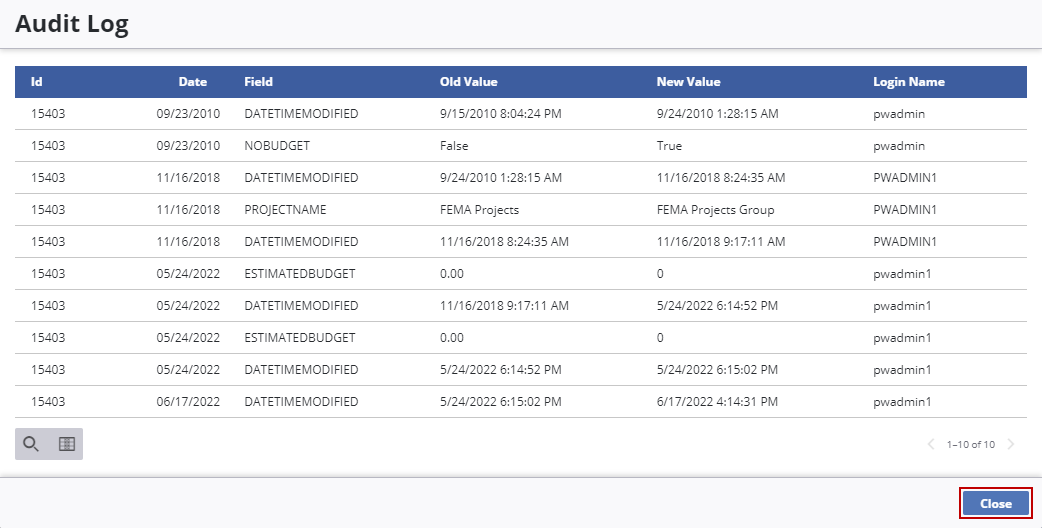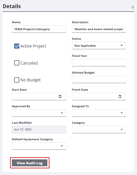 1. On the bottom of the Details panel, click View Audit Log to view all changes that have been made to the project.