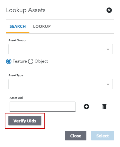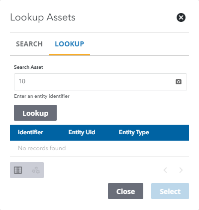 You can search for assets by the asset type, UID, or the entity identifier. You can enter the information manually that is tied to the entity identifier.