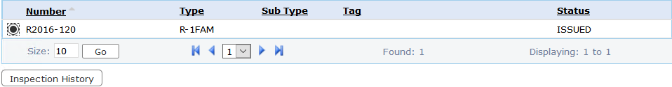 The inspection history appears below. This history includes the inspector's ID, the inspection performed, and the date the inspection was scheduled and completed.