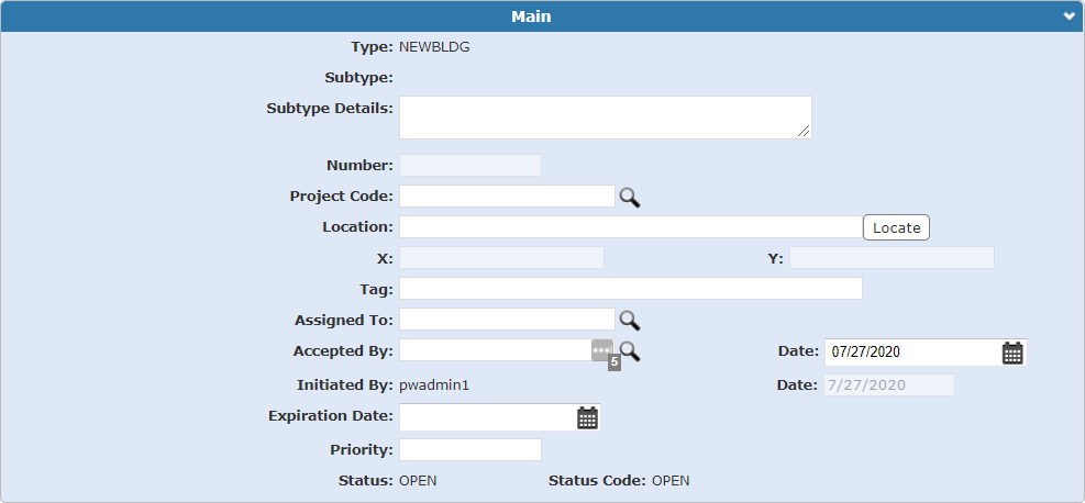 The application input page contains a series of panels that collects information specific to the case being created. It differs for every case type, but the Main panel always appears first and is usually followed by the