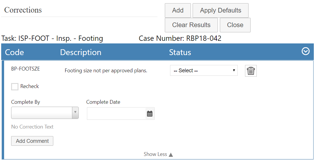 • Apply Defaults: Click to apply the default status (of the correction group the correction task is a part of) to all the correction tasks listed.