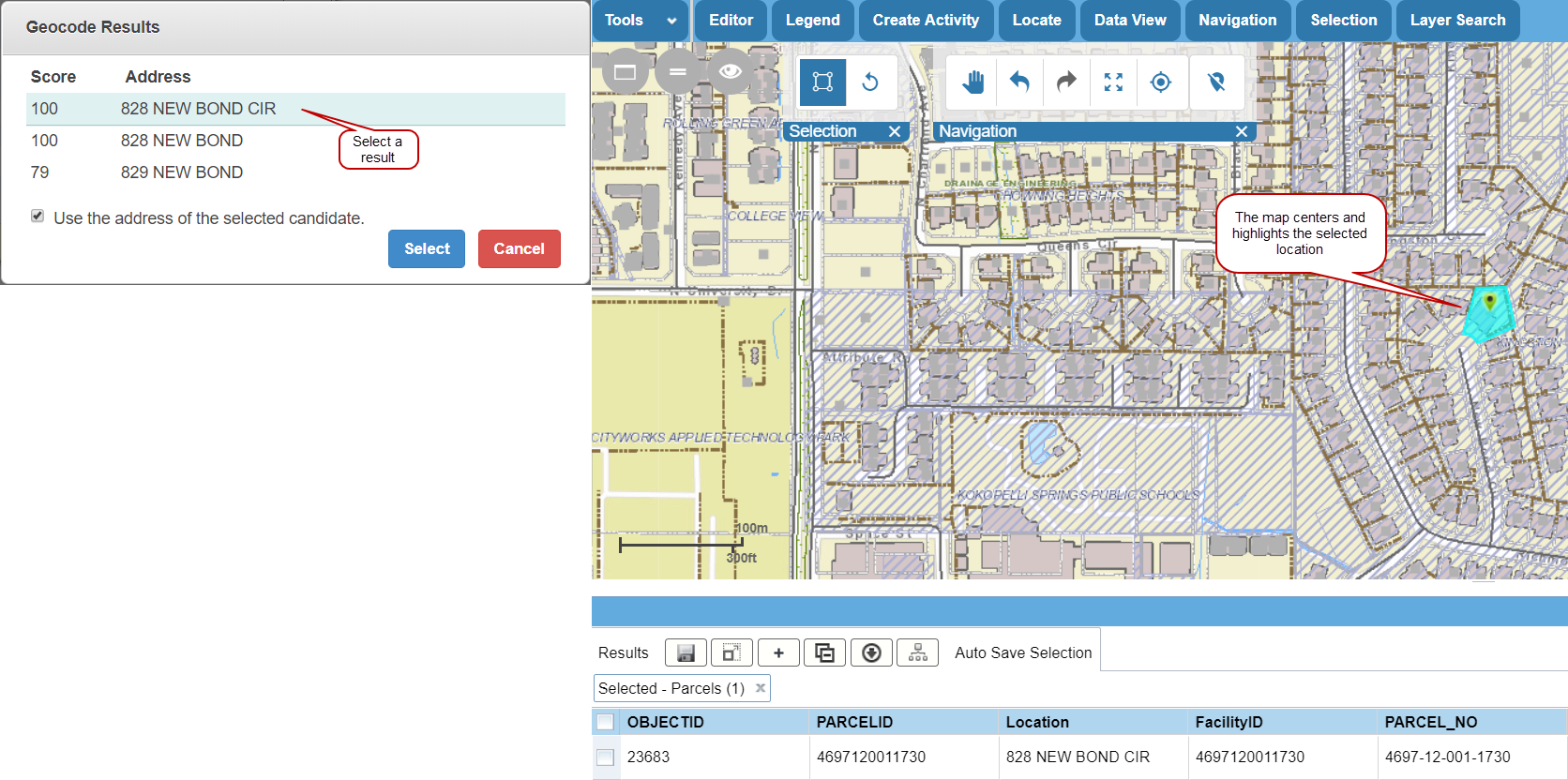 1. After you've selected an address, click Select to apply the results to the case and populate the X and Y fields.