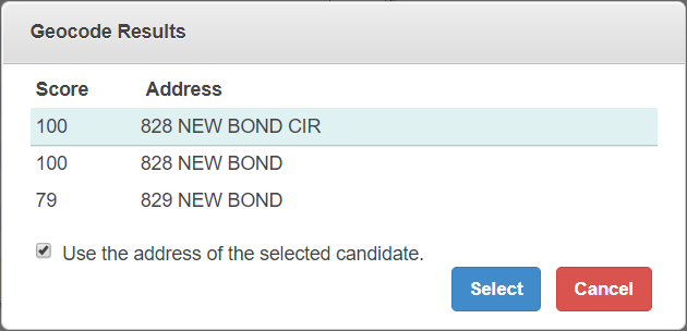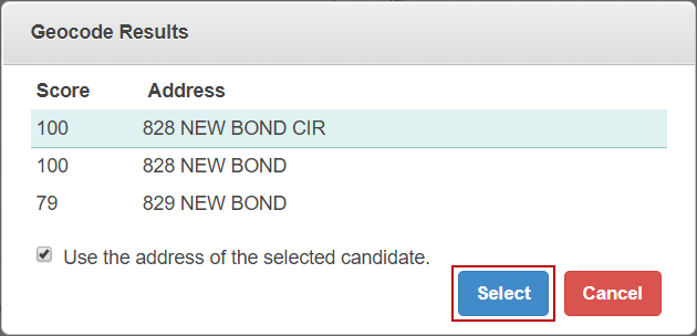 1. Select Use the address of the selected candidate to update to the selected address and its X and Y coordinates. If you do not select this check box, it still updates the X and Y coordinates but does not update the address.