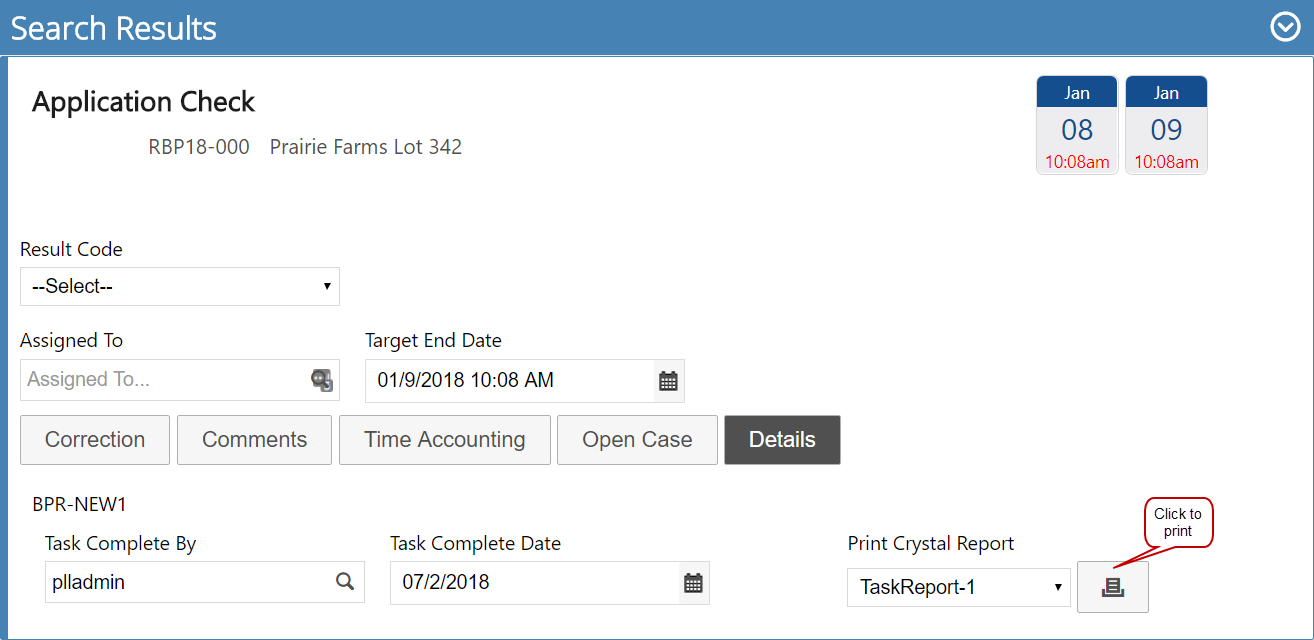 You can print reports associated to a case or a task. If the PLL administrator has associated reports to the case template, they appear on the Main panel of the summary page.