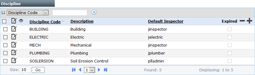 Disciplines are codes that identify either professions or work categories, such as surveyor and design engineer, or plumbing and electrical. Assigning discipline codes to specific tasks and corrections help organize them. Discipline codes also make it easier to schedule inspections and other evaluations by limiting the list of available inspectors to those who are qualified to perform inspections in the specified discipline. From the Discipline panel, you can add new discipline codes or view, edit, or remove existing disciplines.