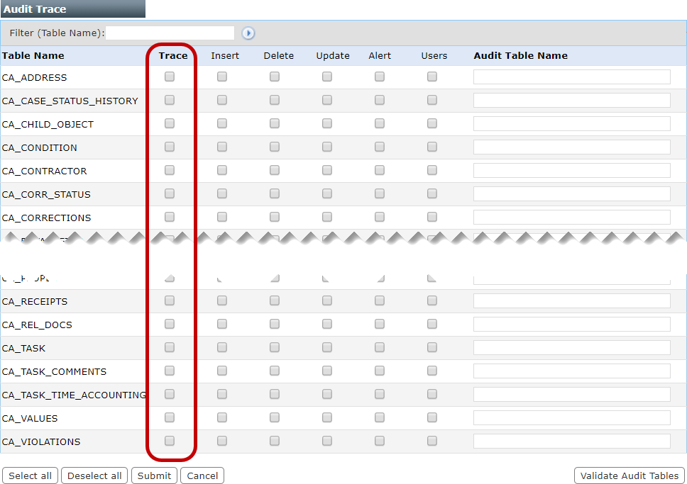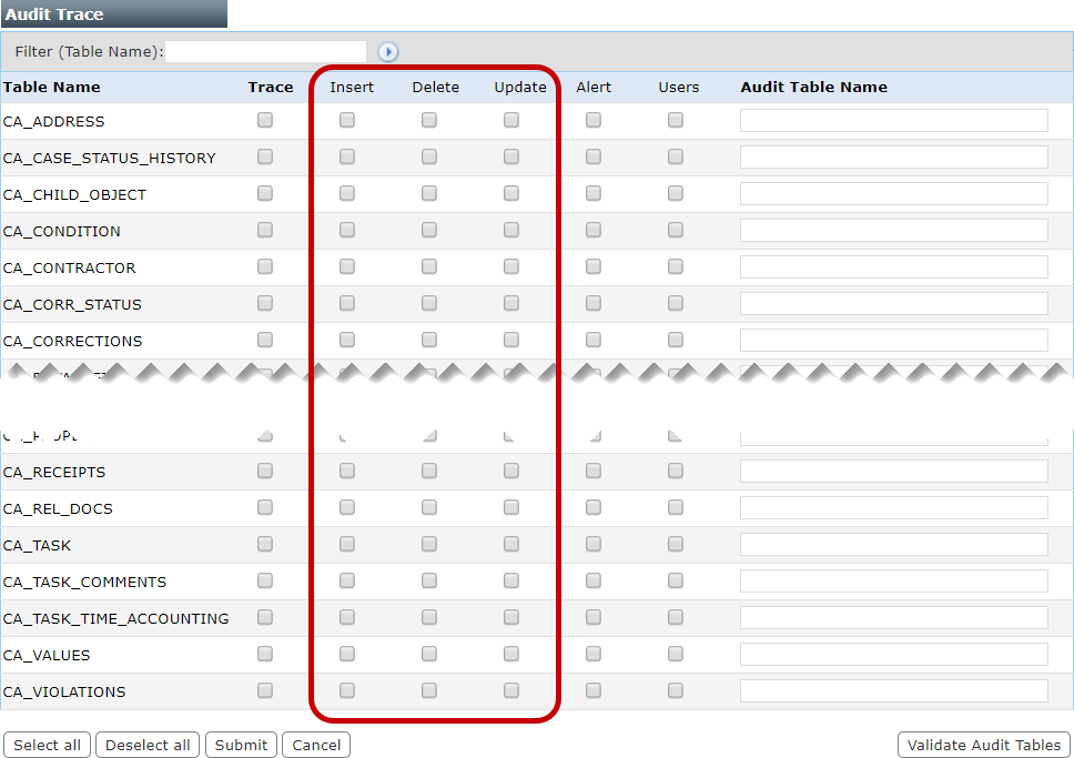 - Click Validate Audit Tables to ensure the audit table have all the same fields as the corresponding CA tables.