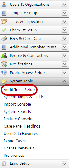 - On the PLL Admin page, click System Tools on the PLL Admin menu panel and select Audit Trace Setup.