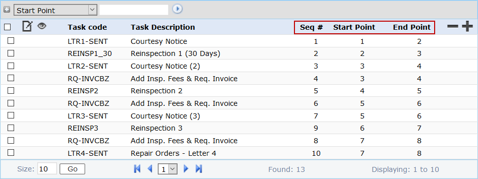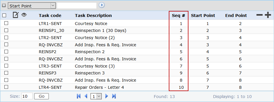 This is because some tasks may have the same Start Point or End Point, or both. For example, tasks LTR2-SENT and RQ-INVCBZ share the same Start Point and End Point in the workflow. Their Seq # values indicate which task should come first in the workflow.