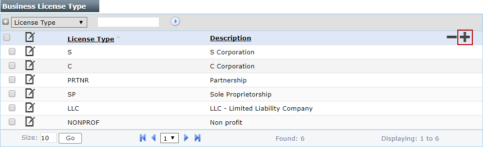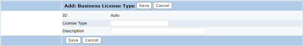 - On the Add: Business License Type panel, enter a 10-character (maximum) code in the License Type field and a brief explanation in the Description field.