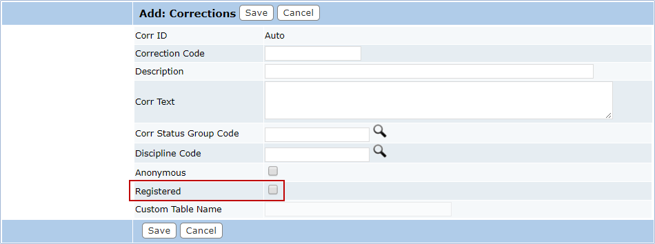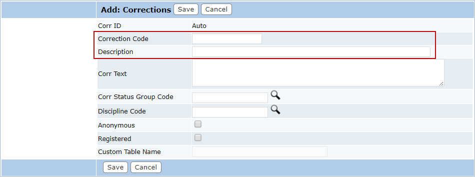 - On the Add: Corrections panel, enter a 10-character (maximum) name in the Correction Code field and a brief explanation in the Description field.