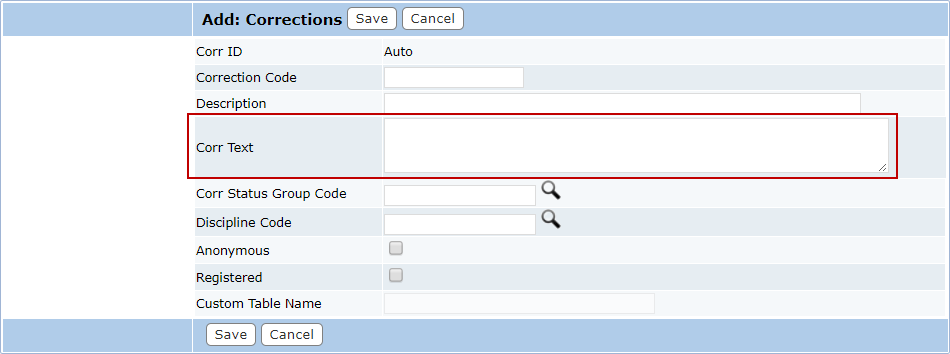 - In the Corr Text field, enter the nature of the problem and the steps necessary to correct it.