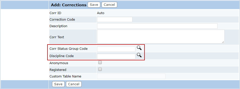 - Click Lookup to the right of the Corr Status Group Code and Discipline Code fields to select the appropriate correction status group and discipline codes.