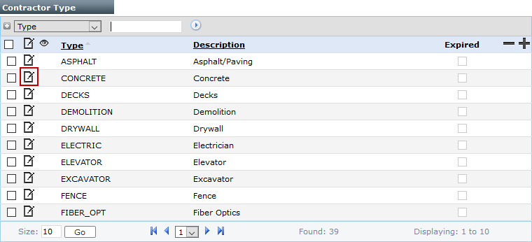 - On the Contractor Type panel, click Edit Record next to the item you want to edit.