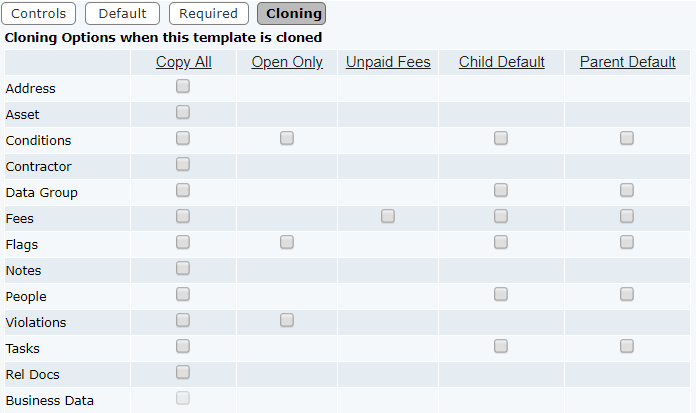 For each data type, the available options for cloning data are denoted by a check box that relates to the column heading above it. Only one option can be selected per row.