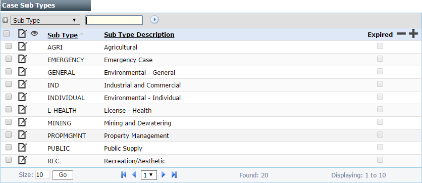 Sub types are different case templates based on a common case type. Using sub types can help improve searches and return more accurate information. Sub types are extremely flexible and diverse, but are not generally a required element of any case type or template. From the Case Sub Types panel, you can add a new sub type or view, edit, or remove existing sub types.